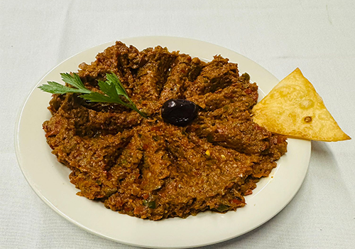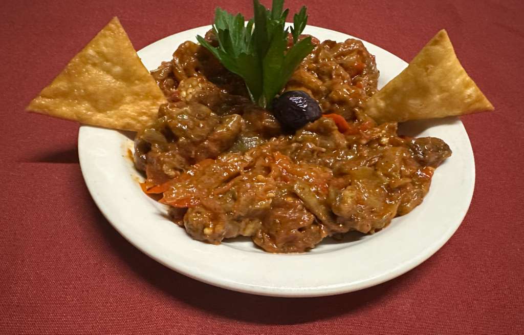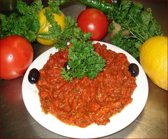 (Eggplant with Sauce) Chopped onions, red and green peppers, tomatoes, walnuts and garlic mixed with olive oil.