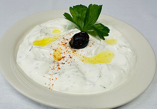 Turkish yogurt mixed with shredded cucumbers, garlic and olive oil.