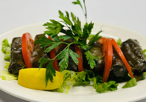(Stuffed Grape Leaves) Turkish grape leaves stuffed with sautéed rice, onions, pine nuts, currants, fresh parsley, herbs with a hint of mint.