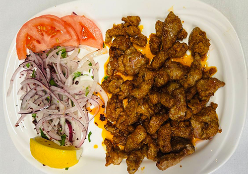 (Fried Liver Cubes) Cubes of calf liver in flour then pan fried with seasonings served with onion salad.