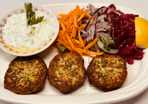 Fresh Zucchini, cheese, parsley, carrots, eggs and herbs blended then pan seared, topped with cacik sauce, served with salad.