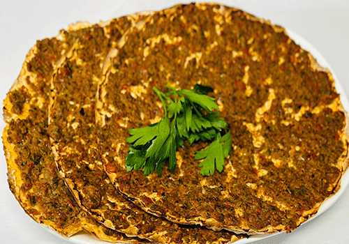 Thick crusty dough topped with ground beef, onion, parsley and spices